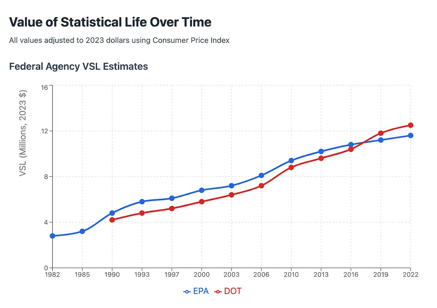 当联邦机构进行成本效益分析时,他们必须计算出一条人命值多少钱。(否则,你怎么知道是否值得修建一条新的州际公路,它可以帮助数百万人准时上班,但可能会因空气污染导致一些额外的死亡?)他们通过询问人们愿意支付多少钱来降低死亡风险来做到这一点,然后他们用这个数字来计算“统计生命价值”(Value of a Statistical Life)。根据 Substack 博主 Linch 的分析,随着时间的推移,这些统计生命的价值已经变得越来越高: