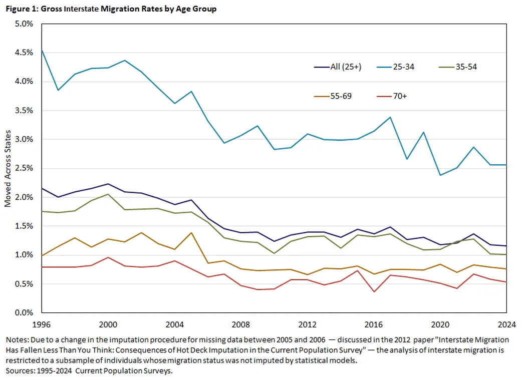 关于这一点我完全错了。自 1980 年代中期以来,美国人搬家的可能性越来越小: