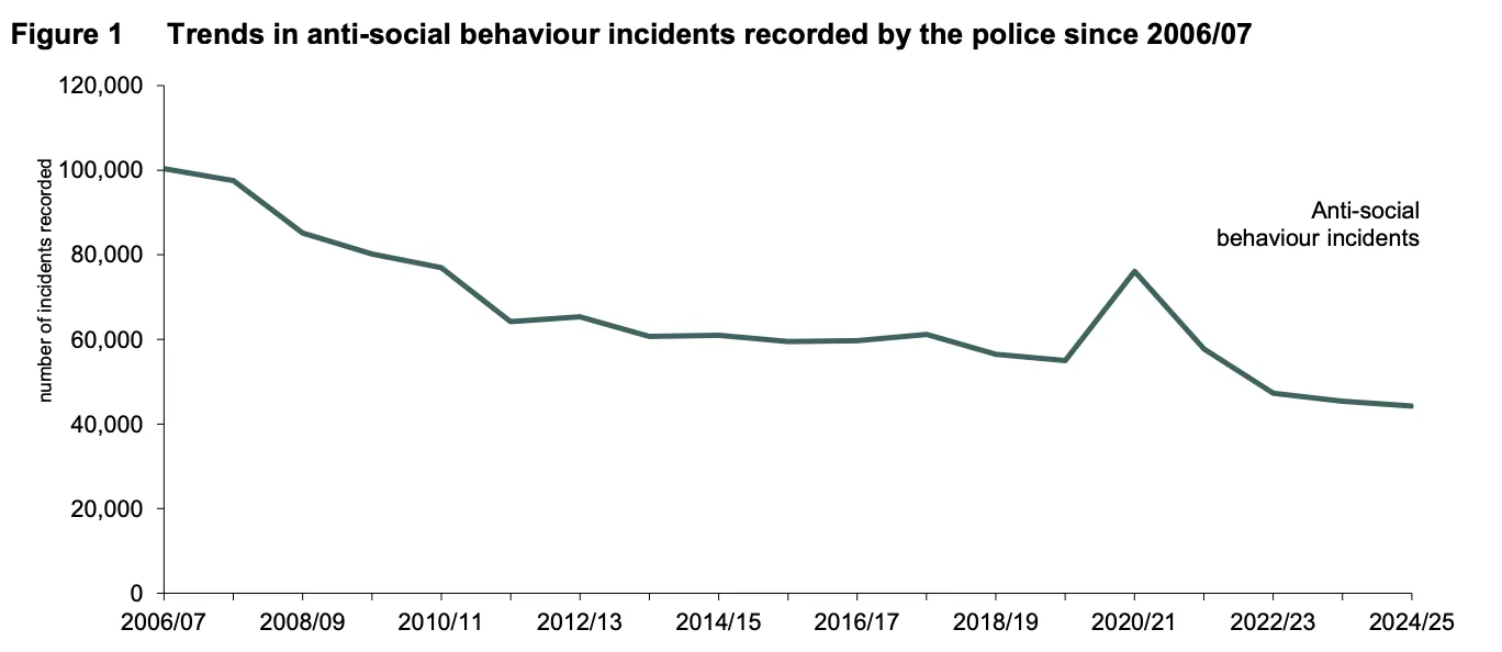 这是来自北爱尔兰关于“反社会行为事件”的类似数据,因为他们恰好追踪了这些数据: