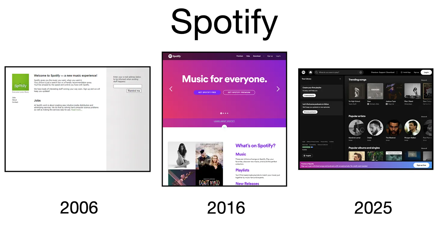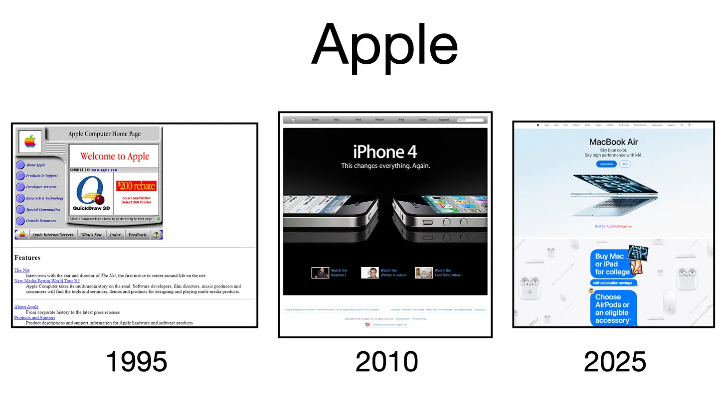 * 每个网站都趋向于同一种外观:圆滑、极简主义的设计元素,配有大量图片。 * 网站美学从 90 年代到 2000 年代再到 2010 年代变化很大,但从 2010 年代到现在变化不大。