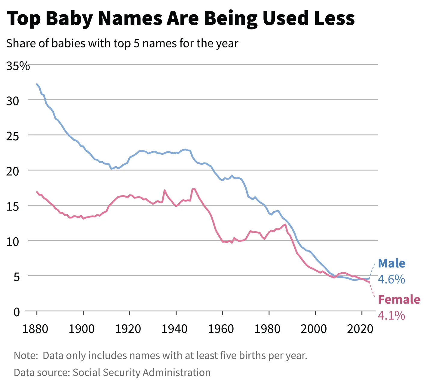 [11] 我向你们展示的几乎所有数据都来自美国,所以我很有兴趣听听世界其他地方正在发生什么。我的预测是,发展起初会导致特立独行的激增,因为人们获得了更多表达自己的方式——例如,当人们唯一能买得起的车是 T 型车时,所有的车看起来都是一样的,然后当更多的竞争者出现时,事情会变得更有趣。但随着变得“怪”的成本增加,你最终会看到离经叛道的衰落。反正这是我的猜测。