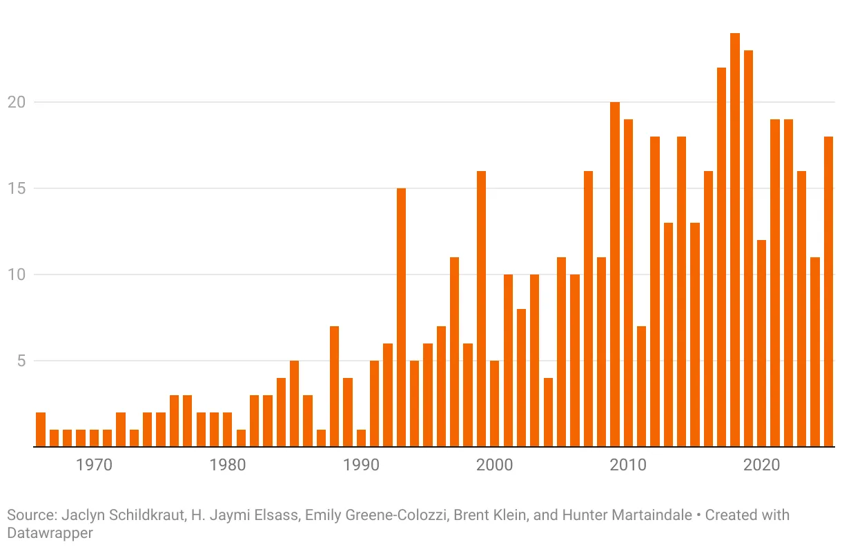 另一种正在消失的离经叛道形式:人们似乎不再加入邪教了。宗教历史学家、一本关于邪教书籍的作者菲利普·詹金斯(Philip Jenkins)报告说,“与 1970 年代相比,邪教问题几乎完全消失了”。[1](鉴于邪教的增加会对詹金斯的新书销量更有利,我倾向于在这个问题上相信他。)关于邪教的形成没有全面的数据集,但 Roger’s Bacon 分析了一个热门且长寿播客中报道过的邪教,发现其中大多数始于 60 年代、70 年代和 80 年代,而在 2000 年之后急剧下降 [2]:
