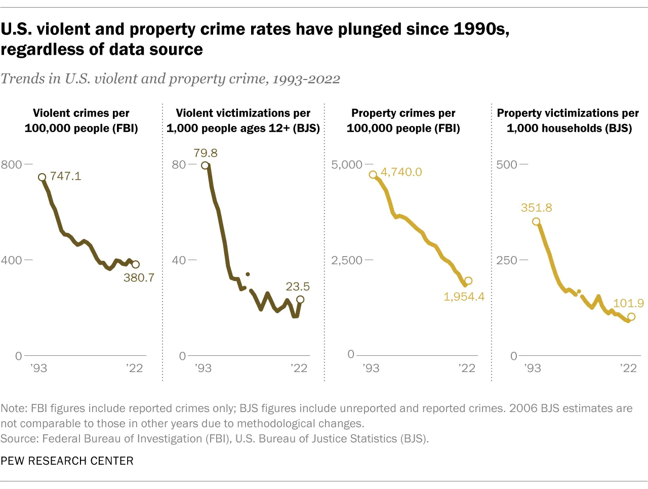 首先,与其他形式的暴力不同,大规模枪击事件自 90 年代以来变得更加普遍(尽管注意 Y 轴,我们谈论的是所有犯罪中极小的一部分):
