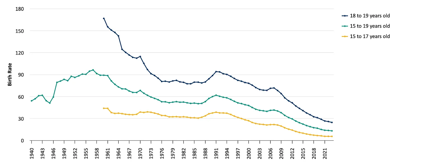 所有这些发现都依赖于调查问卷,所以也许是越来越多的孩子每年都在撒谎?好吧,生孩子这事儿很难撒谎,而自 1990 年代初以来,青少年怀孕率也大幅下降: