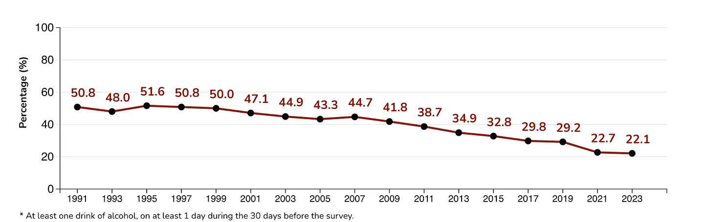 他们吸烟、发生性行为或打架的可能性也降低了,滥用止痛药、使用冰毒、摇头丸、致幻剂、吸入剂和海洛因的可能性也降低了。(现在的孩子不是用电子烟代替抽烟了吗?不:电子烟的使用率在 2015 年至 2023 年期间也有所下降。)大麻的使用在 90 年代末达到顶峰,当时几乎 50% 的高中生报告说他们至少吸过一次。现在这个数字降到了 30%。现在的孩子们甚至更喜欢系安全带。