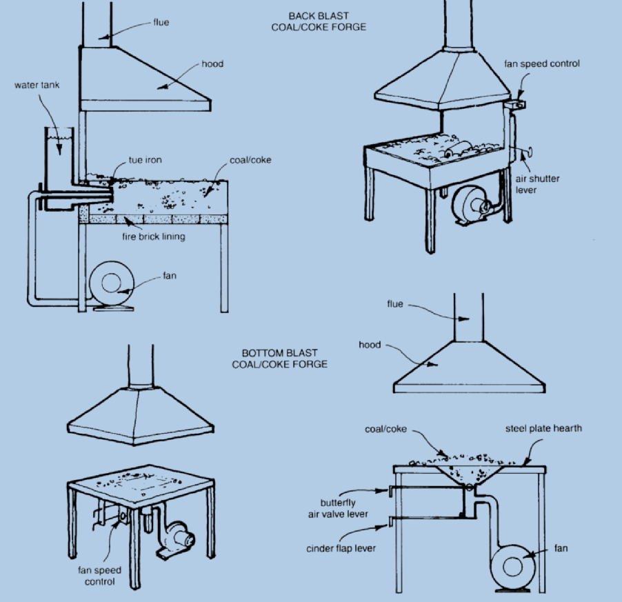 必需的设备是炉子、砧、一个重型台钳和一个工作台。仅用这些和一些手工工具就可以完成很多工作。添加一个手持电动角磨机、一个电弧焊机以及许多其他工具会有优势,这些将在章节中介绍。但无论你还有什么或渴望拥有什么,炉子和砧是工作坊的核心。