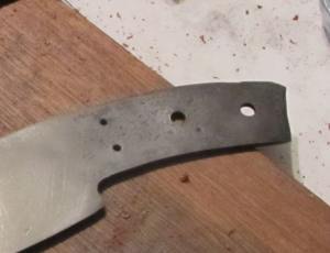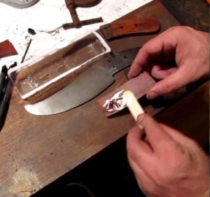 一旦刀背呈现梅子色,刀刃呈现小麦色时,立即浸入油中固定。用金刚砂纸清洁刀身。下一步是将刀柄安装到刀上。