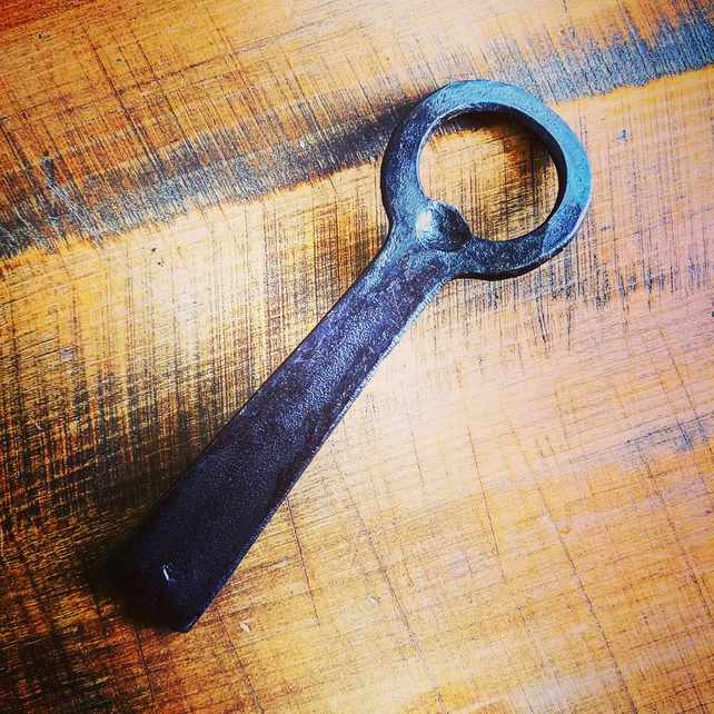 加热并压平金属棒的一端。在上面冲孔并塑造一个大孔,然后通过制作一个唇边来完成,用于钩住并撬开瓶盖。
