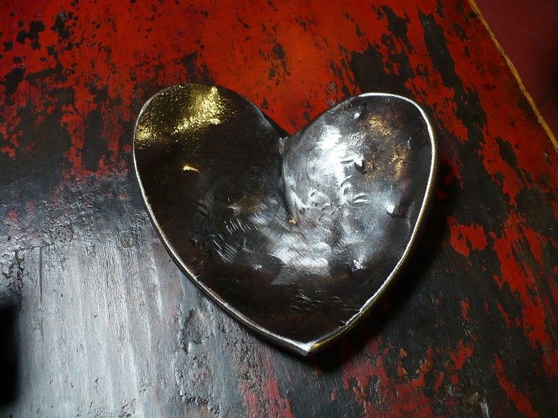 在你锻造出心形金属后,将它移到型砧上,然后继续锤打以制作出圆形的碗状。你可以选择让它保持粗糙的外观,或者将其抛光。你可以将这些碗制作成任何你想要的尺寸;你还可以压印名字或日期,为每位顾客定制。