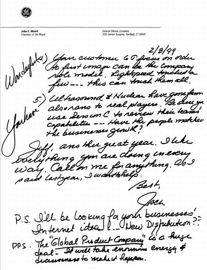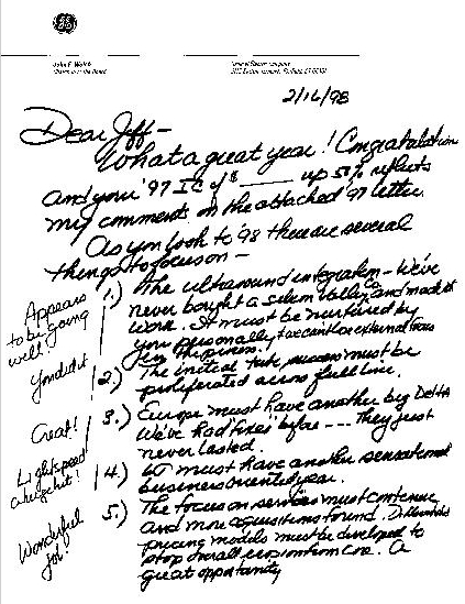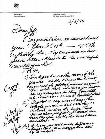 尽管如此,我总能感受到与雷吉之间的某种共鸣。他很少流露感情,从不给出任何暗示。但我有一种感觉,他理解我。在某些方面,我们是志同道合的人。我们尊重彼此的差异,也有一些重要的共同点。我们都喜欢分析和数字,都会做足功课。我们都热爱通用电气。他知道公司必须改变,他认为我有激情和智慧来推动这种改变。