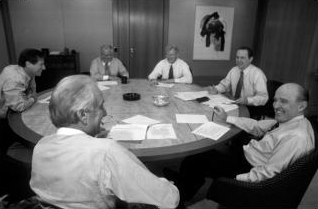 为1997年年报拍照,与副董事长保罗·弗雷斯科(左)、约翰·奥皮和吉恩·墨菲。照片由John Abbott拍摄